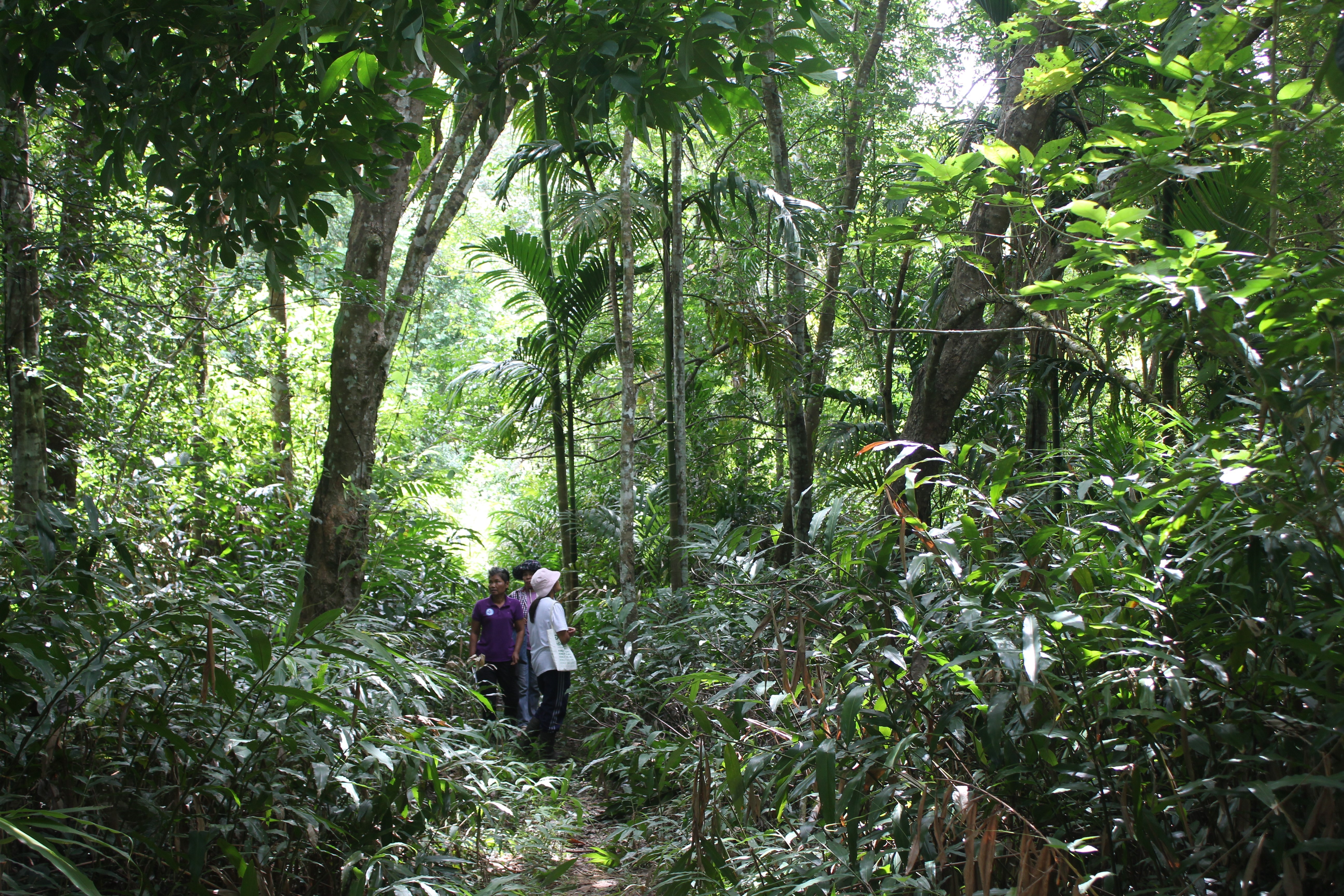 Photo: Farmer data collectors explore a mature rubber forest garden during a workshop on evaluating the biodiversity and structure of forest gardens Phatthalung, Thailand.